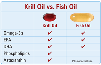 Điểm khác biệt đầu tiên và quan trọng nhất chính là gốc axit béo omega-3. Không giống như omega-3 từ dầu cá có gốc triglyceride, các axit béo omega-3 từ Krill oil hầu hết đều có gốc phospholipid. Triglyceride là một este gồm 3 axit béo liên kết với 1 gốc glycerol, trong khi phospholipid chỉ gồm 2 axit béo liên kết với 1 gốc glycerol. Nhóm phosphat có trong phospholipid liên kết với một đầu hữu cơ ưa nước, đồng thời cũng liên kết với gốc glycerol. Đầu hữu cơ ưa nước này bao gồm choline (là chủ yếu). Cấu trúc khác nhau giữa 2 loại axit béo tạo nên những đặc tính khác nhau giữa chúng. Trong khi triglyceride kị nước và không thể hòa tan thì phospholipid với 1 đầu kị nước và 1 đầu ưa nước giúp nó có khả năng hòa tan tốt hơn, chính điều này dẫn tới khả năng sinh khả dụng của dầu nhuyễn thể tốt hơn dầu cá. Điểm khác biệt thứ hai là về khả năng chống oxi hóa. Trong Krill oil chứa hàm lượng chất chống oxy hóa tự nhiên cao hơn dầu cá đến 48 lần. Astaxanthin là thành phần mang đến tác dụng chống oxy hóa mạnh mẽ cho dầu nhuyễn thể.